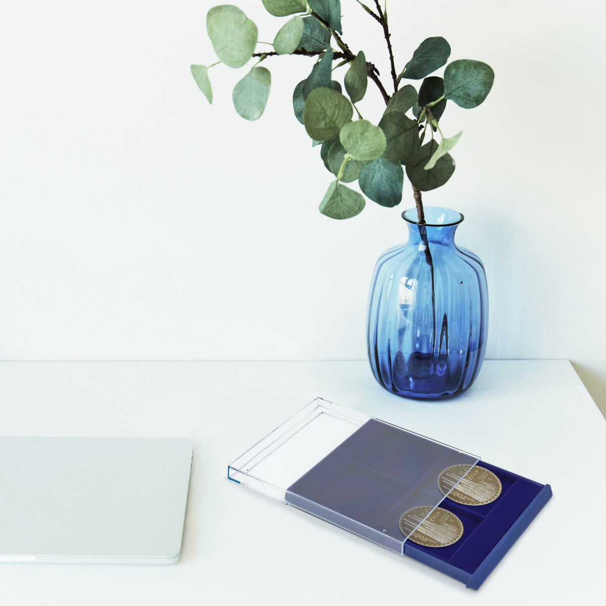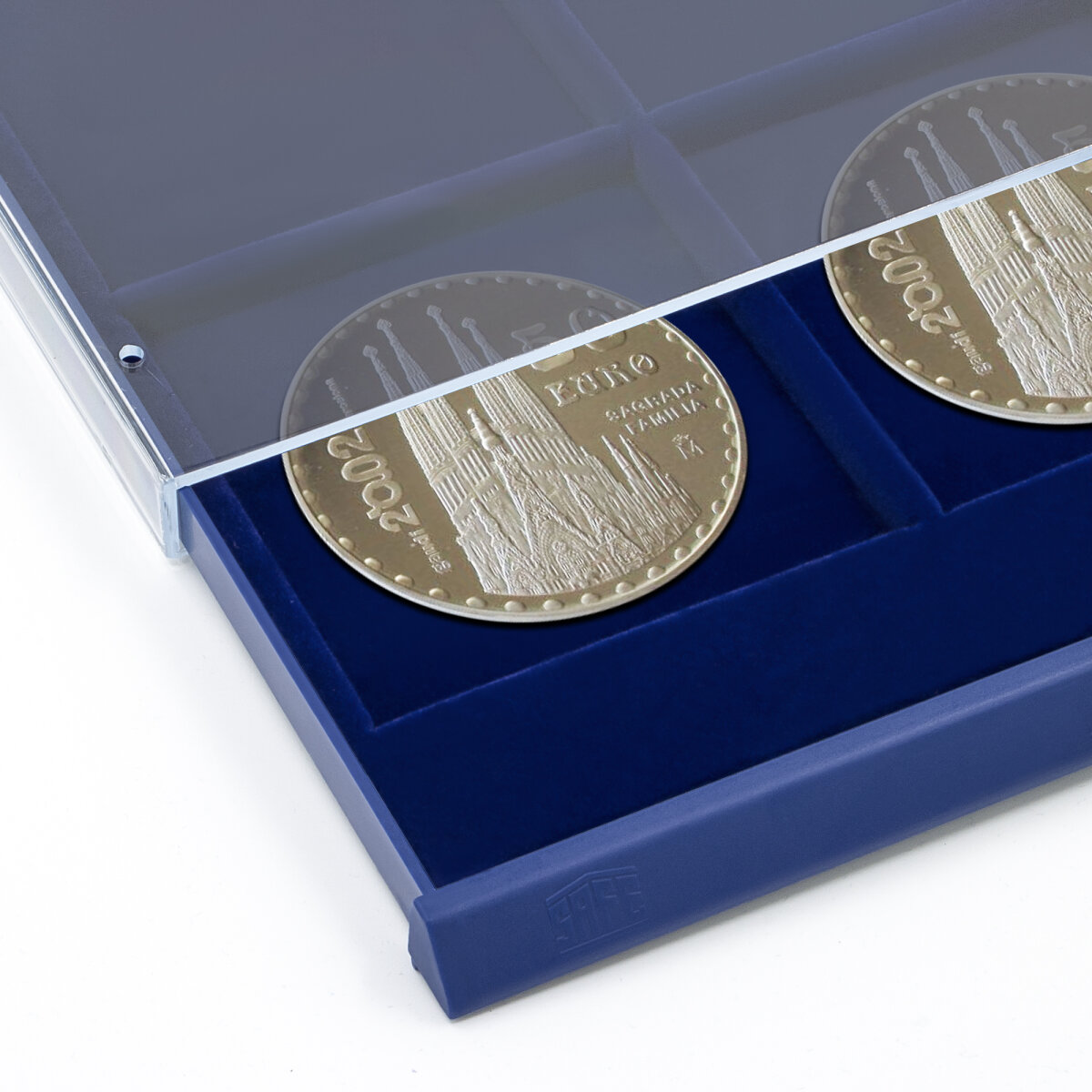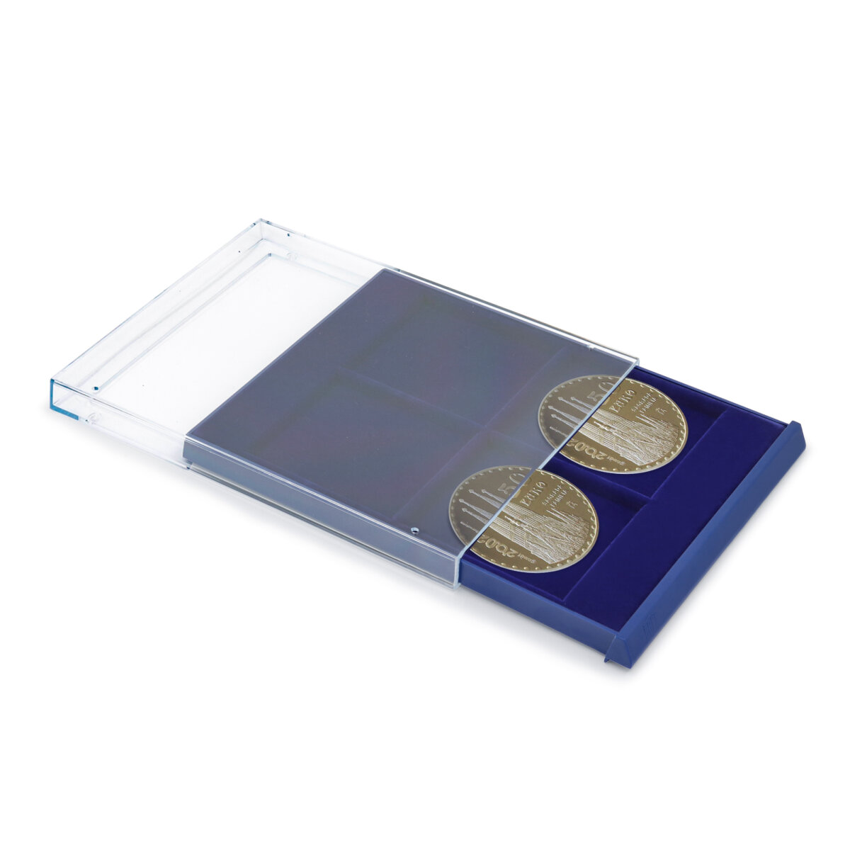 Stapelbare muntenlade met 4 uitsparingen voor objecten met een maximale diameter van 86 mm. Ruimtebesparende, glasheldere acrylglas lade met koningsblauw velours bekleding. De lades passen als een puzzel in elkaar om verschuiven te voorkomen wanneer ze gestapeld zijn. Stapelbaar en met schuine handgreep voor moeiteloos openen van de lade.